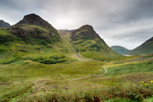 苏格兰大地上有一个大断层,大断层的西边和北边地势较高,这片区域就被称作苏格兰高地(Highlands)。高地地广人稀,和英格兰截然不同,英格兰景色大多是田园的、柔和的,苏格兰高地的景色是苍凉粗犷壮美的的感觉,大多是山丘、峡谷、湖泊地貌。整个高地面积很大,差不多是整个苏格兰面积的一大半。比较有名的天空岛、尼斯湖、英国最高峰本尼维斯山、格伦科峡谷都属于这一区。