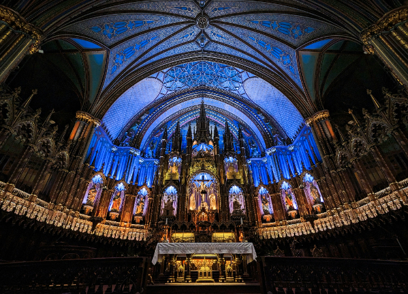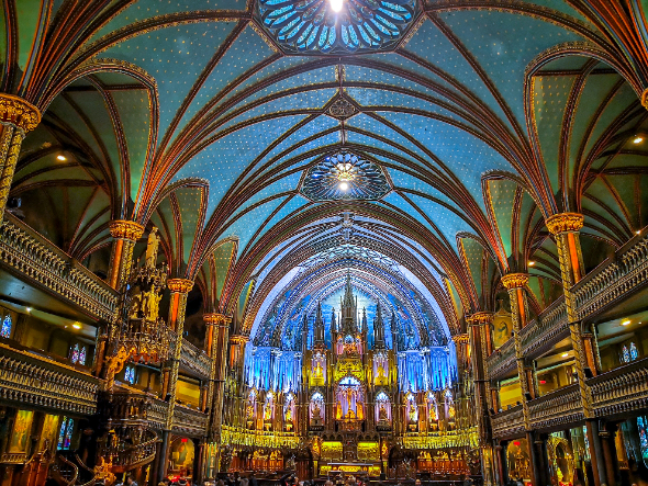 圣母圣殿为哥特复兴式建筑,内部宏伟,色彩绚丽,天花板为深蓝色,装饰金色的星星,其余地方蓝色,红色,紫色,银色和金色。内部有数百木雕。不寻常的是,花窗玻璃没有描绘圣经的场景,而是描绘蒙特利尔宗教历史的场景。还有一台Casavant Frères管风琴。