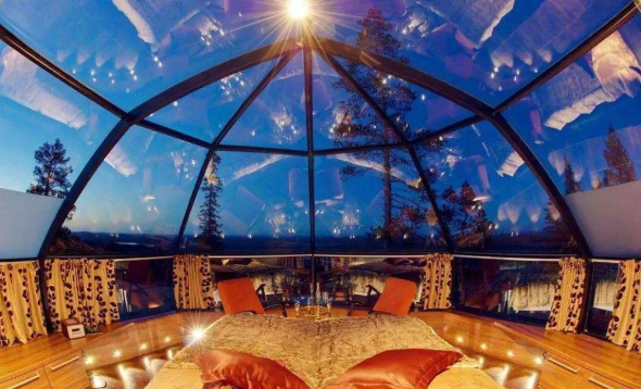 玻璃屋介绍:玻璃屋位于天然的山丘和森林旁边,您能体验拉普兰纯净的雪景美丽,距离小镇中心的餐厅、商店、水疗中心仅500米路程,方便您闲暇时间前往体验,所有玻璃屋内均设有加热天窗,迷你酒吧,热水器,吹风机,独立卫浴以及无线网络连接。