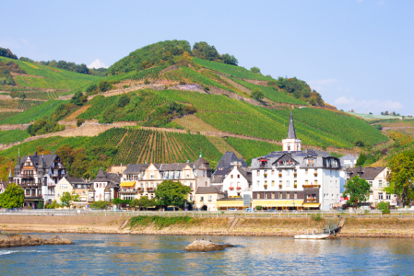 酒乡吕德斯海姆坐落在河岸森林密布的缓缓的山坡上,满城都是重重叠叠的红色屋顶和绿树掩隐的街道,浸漫着花香,闪烁着阳光。小城的一切都是小巧而精致的, 小酒巷、小博物馆、小火车站、小日耳曼尼娅女神像——只有葡萄园是大片大的。葡萄园随着季节的变幻而改变颜色,风光如画的村庄掩映在葡萄园中,每一处庄园都是一个古老的故事。