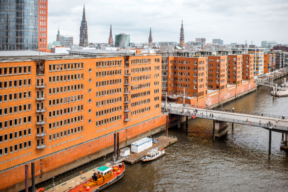 汉堡仓库城自由港区是红砖建筑物的天下, 一向被视为自由港汉堡和德意志帝国统一的标志。这个建于19世纪末的建筑群是世界上最大最古老的仓库建筑群,其面积为30万平方米。它们虽然规模宏大,但看起来却惊人的统一,现在也成为了世界文化遗产。